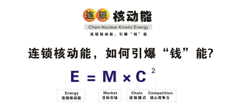 ,這是世界著名的愛因斯坦能量公式?;趷垡蛩固沟南鄬?duì)論和能量公式,產(chǎn)生了原子彈和核電站,今天的人類太空實(shí)踐證實(shí)了愛因斯坦理論的正確性,人類因此發(fā)生了翻天覆地的變化。在愛因斯坦的能量公式中,M是質(zhì)量,C是光速,當(dāng)速度為光速時(shí),即使很小的質(zhì)量也能轉(zhuǎn)化為非常大的能量。 廣州采納企業(yè)管理顧問(wèn)有限公司首席咨詢師陳宏創(chuàng)建的的連鎖核動(dòng)能理論(全名:連鎖內(nèi)核能量裂變激增理論)是以愛因斯坦的能量公式為基礎(chǔ)創(chuàng)建,但其含義和指向是不同的:M=目標(biāo)市場(chǎng)(Market),C1=連鎖模式(Chain),C2 =核心競(jìng)爭(zhēng)力(Competition),其理論意義是,企業(yè)找準(zhǔn)了目標(biāo)市場(chǎng),以連鎖的方式經(jīng)營(yíng),核心競(jìng)爭(zhēng)力越大,推動(dòng)其發(fā)展能量就越大。 連鎖核動(dòng)能理論如何幫助連鎖企業(yè)“引爆錢能”快速發(fā)展?我們用深入淺出的圖形表達(dá)方式對(duì)該理論進(jìn)行分層闡述: